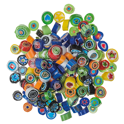 Millefiori шыны түрлі-түсті әйнек қабаттары арасындағы шағын шыны пластиналардың қабаттарынан жасалған.